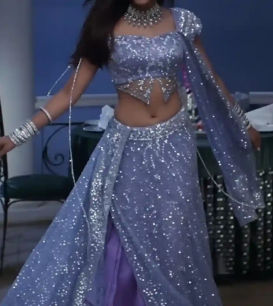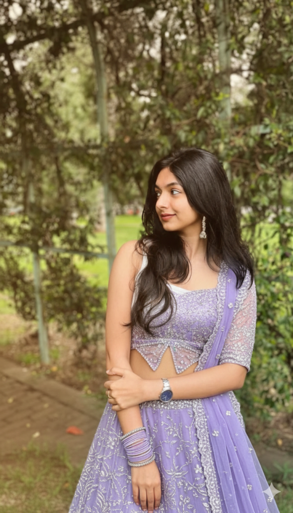PROMPT:- A realistic full-body picture of the woman in the first picture, dressed in an elaborate, glittering purple lehenga choli. The ensemble consists of a voluminous skirt and a short-sleeved crop top with a butterfly-cut hem that are both highly adorned with silver sequins and beading. She has a silky dupatta slung over her shoulder. Warm, radiant sunlight highlights the sheen of the fabric and her jewellery in this scenario, which takes place outside during golden hour. The resort location is still the backdrop.